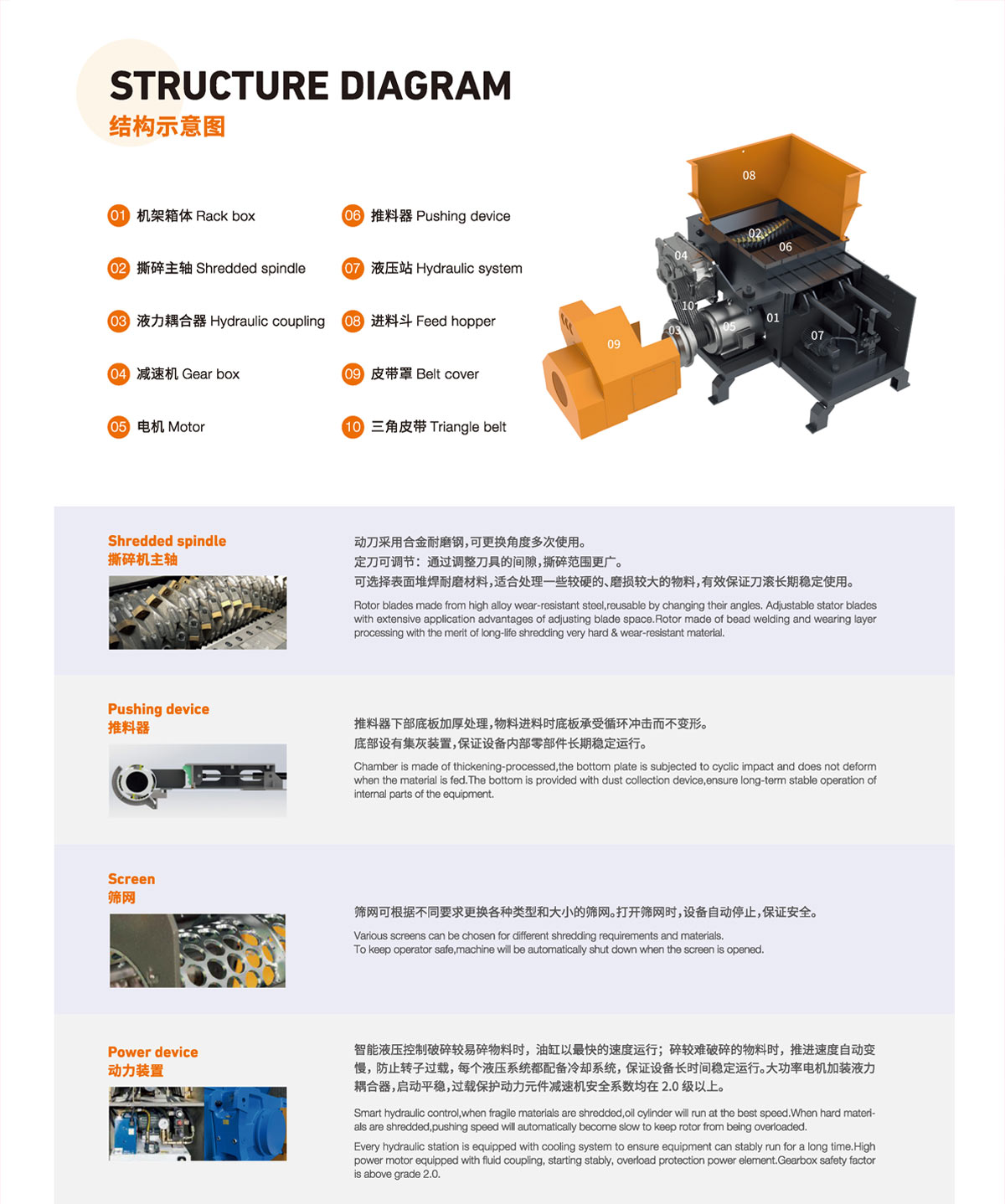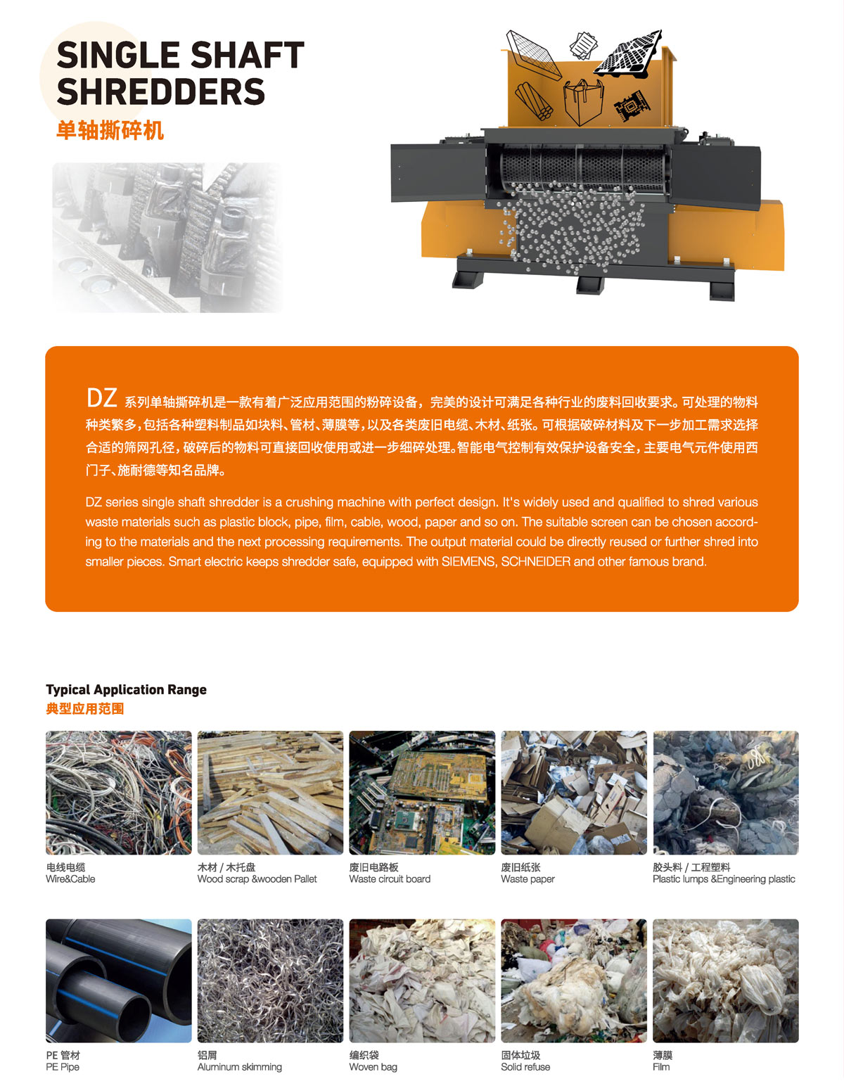 DZ系列单轴撕碎机是一款有着广泛应用范围的粉碎设备,完美的设计可满足各种行业的废料回收要求。可处理的物料种类繁多,包括各种塑料制品如块料、管材、薄膜等,以及各类废旧电缆、木材、纸张。 可根据破碎材料及下一步加工需求选择合适的筛网孔径,破碎后的物料可直接回收使用或进一步细碎处理。智能电气控制有效保护设备安全,主要电气元件使用西门子、施耐德等知名品牌。 单轴撕碎机是一款智能型撕碎机,采用德国技术,西门子控制系统,它是由液压推料系统负责将物料推送至刀轴上进行撕扯、挤压、剪切,推料装置根据撕碎机的负载情况自动伸缩,可通过抓机或者叉车批量投入物料,无需人工看守,自动给料,过载自动反转或停机,减少人力。
