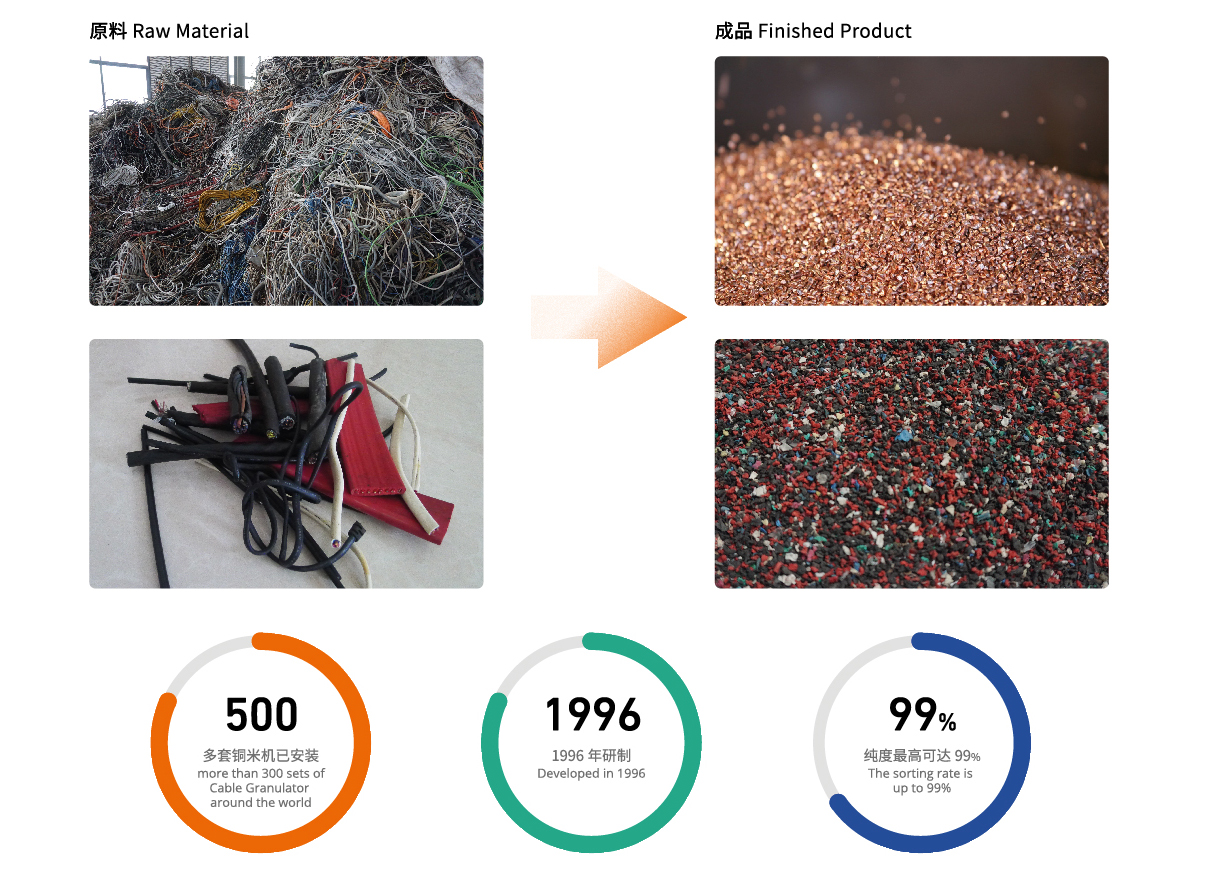 在全世界,已使用或被淘汰下来的废旧电缆线种类繁多,我们的目的在于克服再生处理时铜及其它副产物的损失,使其更加科学化、自动化。它裁减了人员,提高回收率,进而提高了生产效率。 美新源环保于1996年研制出电缆线回收自动化生产线,并以其铜产物形似米粒,命名其“铜米机”,至今在全世界已经安装了500多套铜米机,足见客戶对我们的高度认可。